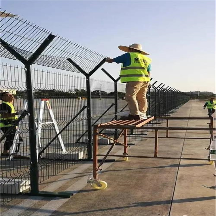 標(biāo)準(zhǔn)的機(jī)場(chǎng)圍界采用直徑5.0mm優(yōu)質(zhì)低碳鋼絲焊接,網(wǎng)孔50mm*100mm,50*200mm,也可根據(jù)要求定做。Y型安全防御護(hù)網(wǎng)所用的立柱為60X60的矩形鋼或圓管立柱,頂端焊有V型支架,也可采用70mmX100mm的掛式連接立柱。產(chǎn)品均為熱鍍鋅后采用高質(zhì)量的聚酯粉末靜電噴涂,采用國(guó)際流行的RAL顏色。連接方式主要使用M卡,抱卡連接,表面處理常用熱鍍、噴塑、浸塑,常見顏色為綠色。具有美觀、實(shí)用、方便運(yùn)輸和安裝的特點(diǎn),安裝時(shí)還能適應(yīng)地形,與立柱連接位隨地面起伏可上下調(diào)整。