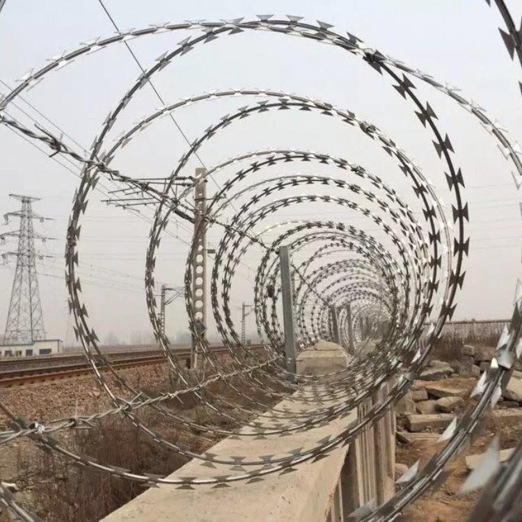 (1)刺絲滾籠采用刀片刺繩繞圈后相鄰兩圈每隔120度用刺絲連接卡固定,張開后形成蛇腹網(wǎng)狀,閉合后刀片刺繩卷徑為50cm,張開后每交叉圈安裝間距20cm,直徑不小于45cm。(2)刀片刺繩由沖切鋼板采用機(jī)械軋?jiān)阡摻z上成型,刀刺寬度22mm,刀刃垂直間距15mm,刀刺縱向間距34mm,芯絲直徑為2.5mm。刀片厚度0.5mm的Q195鋼板網(wǎng)沖切制作。芯絲由HPB300 -6.5mm高線鋼絲冷拔加工。