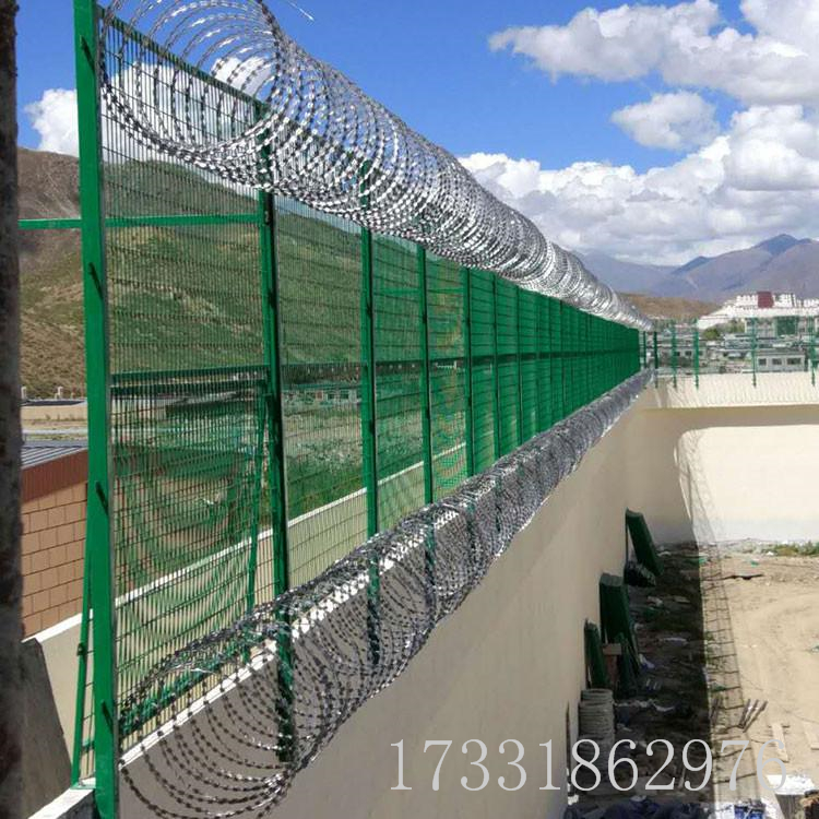 看守所監(jiān)墻內側刀刺鋼網墻高度是多少。看守所刀刺鋼網墻高度有2.5m和4.5m兩種,也是常用的兩種。這兩種高度都包括頂部50公分蛇腹網,底部為刀刺鋼網墻。4m高刀刺鋼網墻可以用上下兩片來連接。