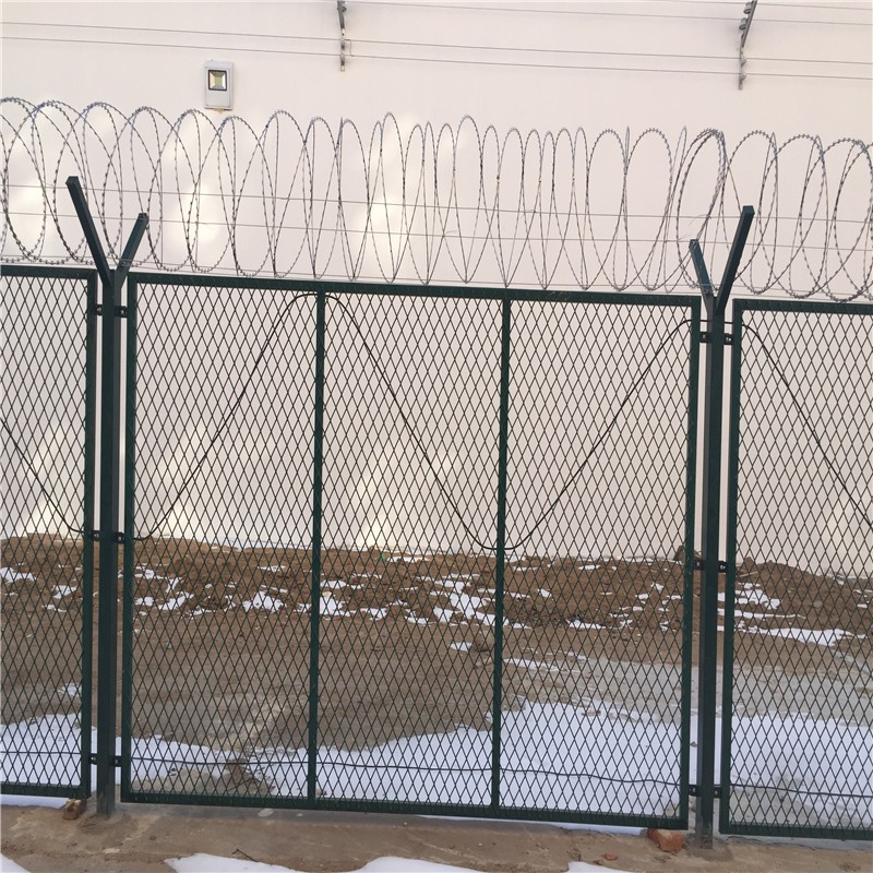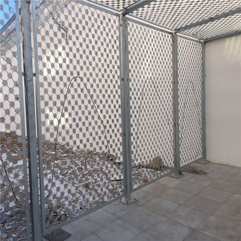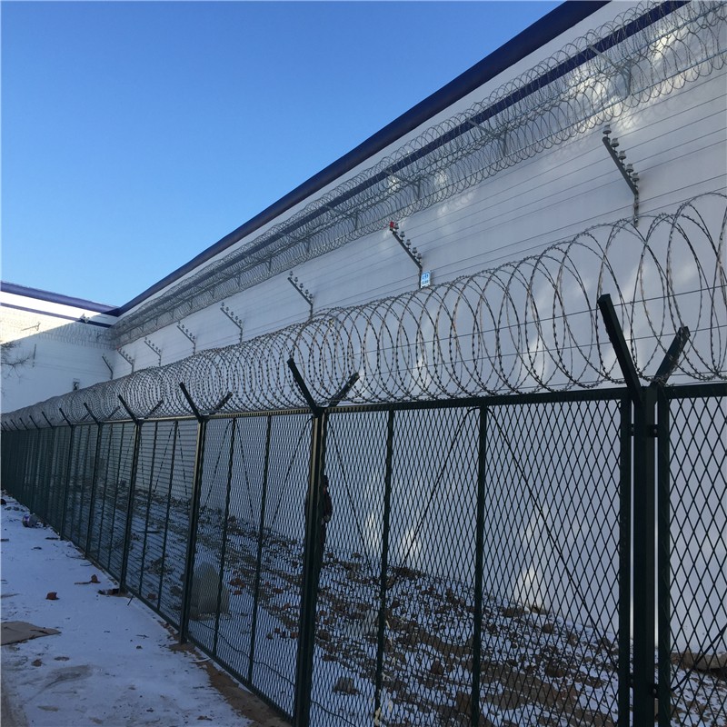 監(jiān)獄刀片刺網(wǎng)主要是由熱鍍鋅鋼板或不銹鋼薄板沖壓而成的,它擁有尖銳的刀片,高張力鍍鋅鋼絲或者不銹鋼絲做芯線組合而成的產(chǎn)品。由于刺網(wǎng)的形狀很特別,而且每個(gè)角度都有尖狀刀片,因而能達(dá)到極好的防御保護(hù)效果。產(chǎn)品具有結(jié)構(gòu)新穎、堅(jiān)固緊密、網(wǎng)面平整、網(wǎng)孔均勻、刀鋒銳利、防攀爬、抗腐蝕性強(qiáng)等特點(diǎn)。建設(shè)于監(jiān)獄的內(nèi)外墻地面及高墻之上,形成一道高不可攀、難以逾越的隔離障礙。具有嚇阻、防翻越等效果,材質(zhì)堅(jiān)硬,高強(qiáng)度,高張力,造型設(shè)計(jì)獨(dú)特,不宜觸摸,因而能達(dá)到極好的防護(hù)隔離效果.