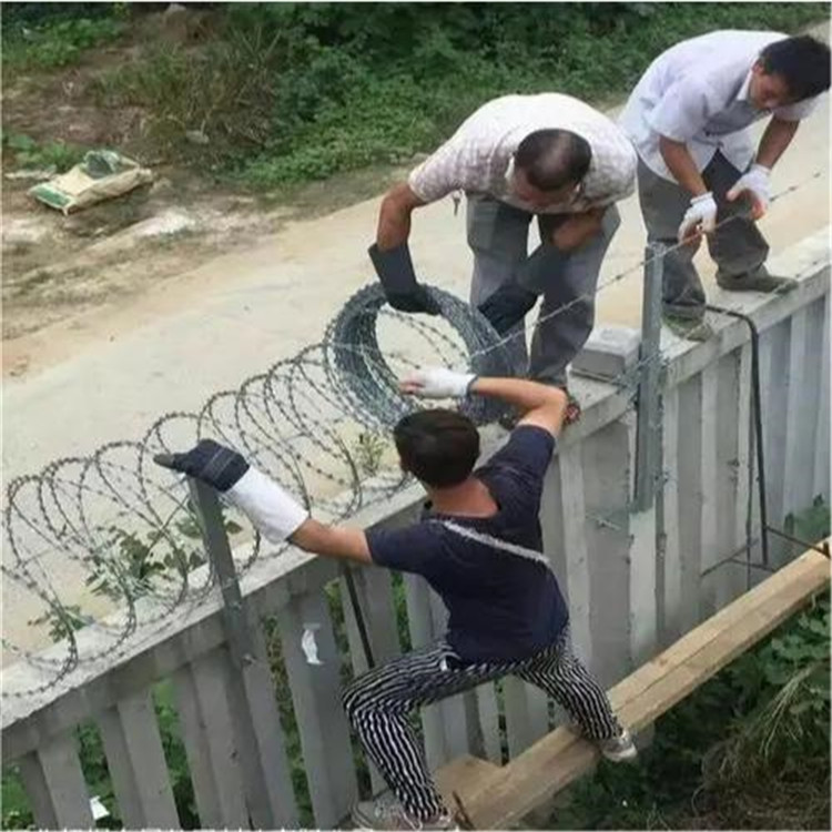 圍墻刀刺網(wǎng)安裝,可根據(jù)圍墻的長度設(shè)計需要使用多少根Y字支架,一般以3米的間距為好,把Y字型支架固定在圍墻上面,其中Y字形支架可根據(jù)您的實際情況進行打孔,用膨脹螺絲固定,以此為了安裝刀刺網(wǎng)的時候起到固定的作用。然后刀刺網(wǎng)的Y字支架上兩邊各拉一根鋼絲,并用專業(yè)的卡扣鉗子將卡扣和鋼絲卡緊,對刀刺網(wǎng)加以固定,以免左右搖晃。