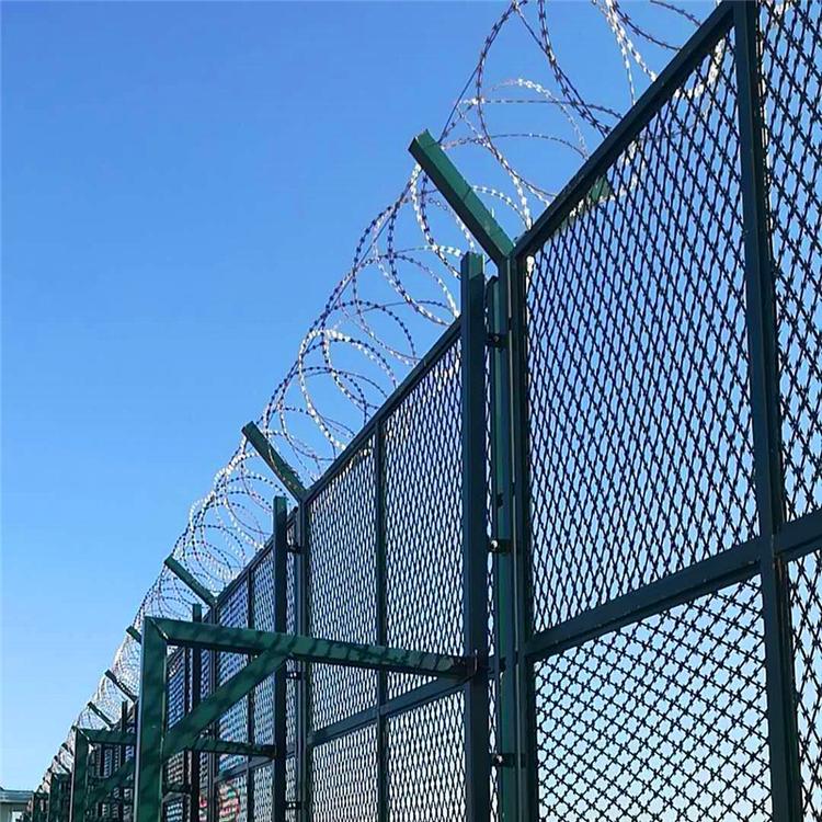 監(jiān)獄防護(hù)鋼網(wǎng)墻 監(jiān)獄隔離警戒網(wǎng)是非常重要的監(jiān)區(qū)安全防護(hù)設(shè)施,是由焊接鋼網(wǎng)加蛇腹形刀刺網(wǎng)組合而成。產(chǎn)品具有結(jié)構(gòu)新穎、堅(jiān)固緊密、網(wǎng)面平整、網(wǎng)孔均勻、刀鋒銳利、防攀爬、耐腐蝕性強(qiáng)等特點(diǎn)。Y型架上邊架蛇腹型刀刺:由熱鍍鋅鋼板或不銹鋼薄板沖壓出尖利的刀片狀,高張力鍍鋅鋼絲或者不銹鋼絲做芯線組合而成的阻盡器材。刀刺直徑采取50-60厘米,刀型整潔、刀片鋒利、排列均勻致密、連接堅(jiān)固、防腐才能強(qiáng),可能達(dá)到防攀越、防拆卸更高保險(xiǎn)等級(jí)。