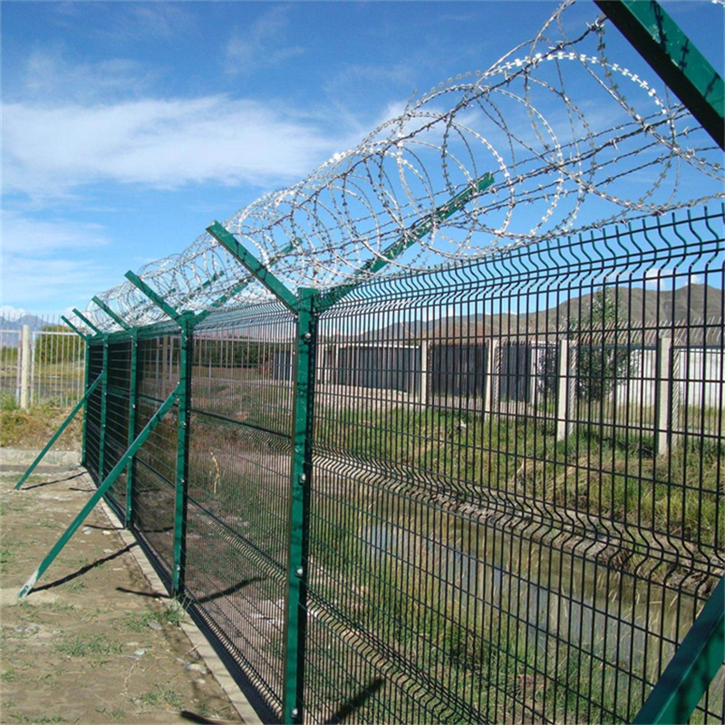 機場圍界又稱作“Y型安全防御護網”,是由V型支架立柱,加強型焊接片網,安全防盜連接件和熱鍍鋅刀片刺籠組成強度和安全防御性級別很高。近年來,被廣泛應用在機場,軍事基地等高安全場所。如果在機場護欄網頂部加裝刀片刺絲、刀片刺繩后又很好的增強了安全防護性能。機場護欄網造型美觀、花色多樣,既起到圍欄作用,又起到美化作用。由于具有安全性高、防攀爬能力好,網片連接方式采用特制SBS緊扣件,有效防止人為的破壞性拆卸,橫向四道折彎加強筋,使網面強度顯著增加。