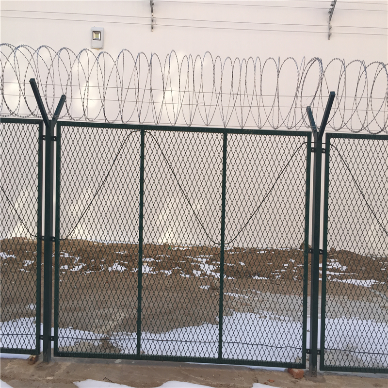 監(jiān)獄護欄網(wǎng)又稱作"Y型安全防御護網(wǎng)"和機場護欄網(wǎng)通用,是由V型支架立柱,加強型焊接片網(wǎng),安全防盜連接件和熱鍍鋅刀片刺籠組成強度和安全防御性級別很高。近年來,被廣泛應(yīng)用在監(jiān)獄,軍事基地等高安全場所。注:如果在監(jiān)獄護欄網(wǎng)頂部加裝刀片刺絲、刀片刺繩后又很好的增強了安全防護性能。采用電鍍、熱鍍、噴塑、浸塑等防腐形式,具有很好的抗老化、抗曬、耐候等特點。其產(chǎn)品造型美觀、花色多樣,既起到圍欄作用,又起到美化作用。由于具有安全性高、防攀爬能力好,網(wǎng)片連接方式采用特制SBS緊扣件,有效防止人為的破壞性拆卸,橫向四道折彎加強筋,使網(wǎng)面強度顯著增加。