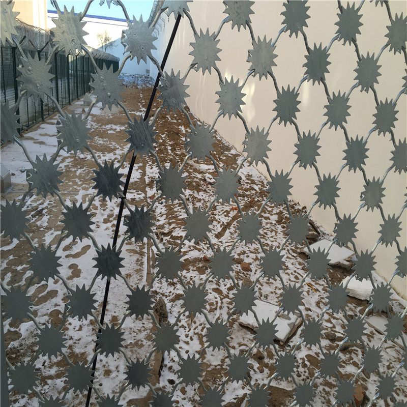 1、梅花刺片護(hù)欄網(wǎng)又名太陽花刺片隔離網(wǎng),為太陽的后裔單層梅花刺片網(wǎng),直徑不小于7.5cm,刺片厚1.5mm,采用Q235低碳鋼板沖壓成型。