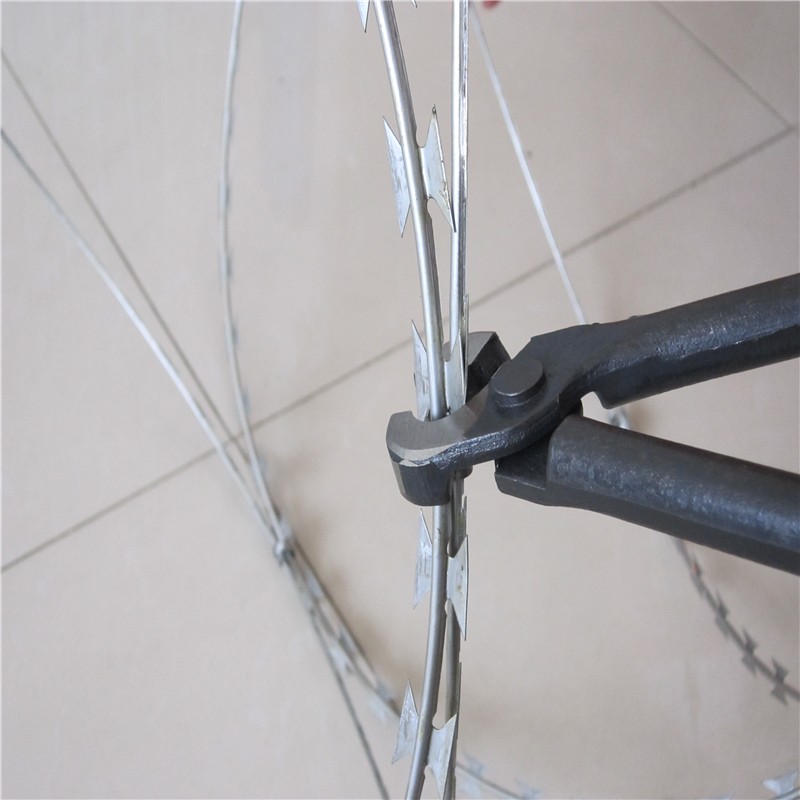 刀片刺繩護(hù)欄網(wǎng)是一種近年發(fā)展起來(lái)的防護(hù)、隔離能力較強(qiáng)的新型防護(hù)網(wǎng)產(chǎn)品。它采用鋼板沖壓成型包附于熱鍍鋅鋼絲(筋絲)之上,由銳利尖角鍍鋅鋼板或不銹鋼薄板做刀片,高張力鋼絲做芯線組合而成的。鋒利的刀型刺由雙線扣裝后成蛇腹?fàn)?,既美觀又讓人不寒而栗。起到了很好的阻嚇作用。