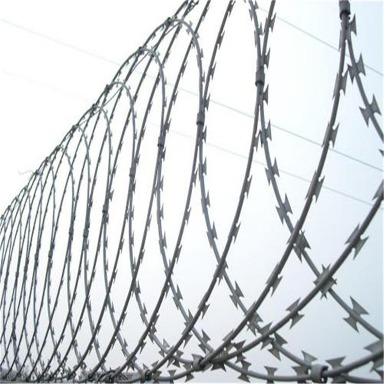 工藝:它采用鋼板(刀板)沖壓成型包附于熱鍍鋅鋼絲(芯線)之上,由銳利尖角鍍鋅鋼板或不銹鋼薄板做刀片,高張力鋼絲做芯線組合而成的。