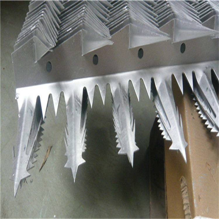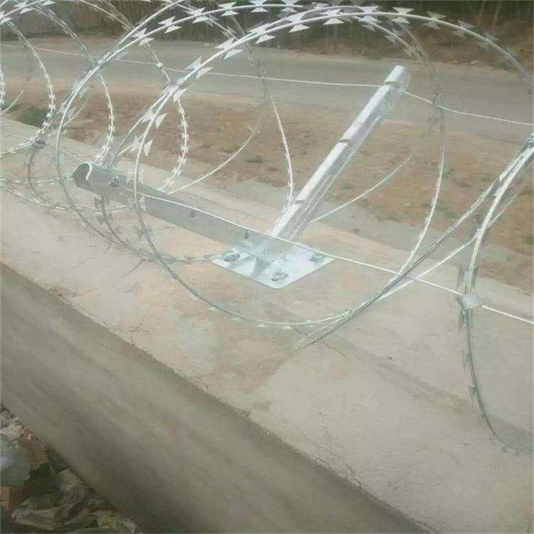 刀刺網(wǎng)支架,圍墻刀片刺網(wǎng)V型支架采用50*50mm方管做支架,方管上焊有與拉絲連接的L型鐵鉤,底座與圍墻連接采用200*200mm鋼板,大大的增強(qiáng)了支架與墻體的牢固度。V型支架里外均采用熱浸鋅處理,使支架的防腐壽命更長(zhǎng)。支架的安裝應(yīng)分段進(jìn)行:先安裝兩端的支架,然后拉線埋設(shè)中間的立柱??刂浦Ъ芘c中間支架的平面投影在一條直線上,不得出現(xiàn)參差不齊的現(xiàn)象。刀刺網(wǎng)支架在圍墻上的固定方法一般為底盤(pán)打膨脹螺絲固定。固定好后,方可進(jìn)行蛇腹形刀刺網(wǎng)安裝。安裝好支架立柱了,先把要安裝刀片刺繩的拉絲給固定上,然后利用拉絲的支撐力來(lái)安裝刀片刺繩,并用專用的卡扣、卡鉗進(jìn)行固定。