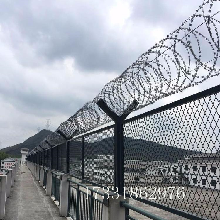 看守所隔離網(wǎng)又稱監(jiān)獄護欄網(wǎng)或監(jiān)獄隔離柵,主要是采用高強度的刀片刺網(wǎng)與普通防護網(wǎng)的結(jié)合,由v型支架立拄,加強型焊接片網(wǎng),安全防盜連接件和刀片刺網(wǎng)組成.刀片刺網(wǎng)是一種新型防護網(wǎng),由銳利尖角鍍鋅鋼板或不銹鋼薄板做刀片,鋼絲做芯線組合而成的防護器材.