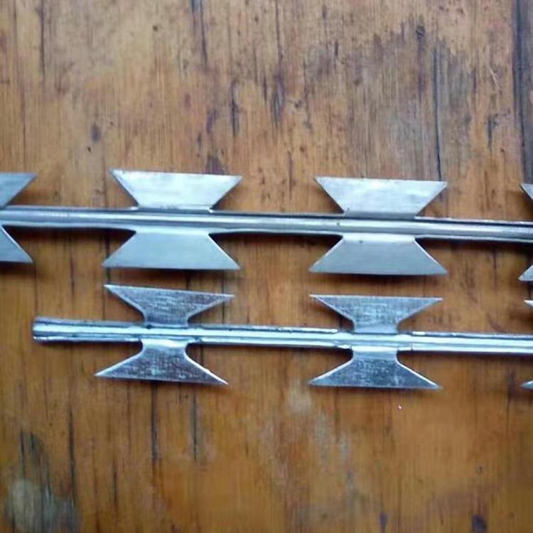 (1)刺絲滾籠采用刀片刺繩繞圈后相鄰兩圈每隔120度用刺絲連接卡固定,張開后形成蛇腹網(wǎng)狀,閉合后刀片刺繩卷徑為50cm,張開后每交叉圈安裝間距20cm,直徑不小于45cm。(2)刀片刺繩由沖切鋼板采用機械軋在鋼絲上成型,刀刺寬度22mm,刀刃垂直間距15mm,刀刺縱向間距34mm,芯絲直徑為2.5mm。刀片厚度0.5mm的Q195鋼板網(wǎng)沖切制作。芯絲由HPB300 -6.5mm高線鋼絲冷拔加工。