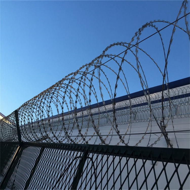 監(jiān)獄防攀爬金屬隔離網(wǎng)安裝刀刺網(wǎng)要求標準:材質(zhì)使用不銹鋼304蛇腹形刀刺網(wǎng),常用圈徑500-600mm,部分地區(qū)也有用450mm,或800mm,刀片長22mm+-1mm,寬15mmt+-lmm,板厚0.5mm+-0.05mm,內(nèi)絲經(jīng)2.5mmt+-0.1mm,刀間距36mm+-1mm; 技術(shù)要求:每米10個單圈,多用刺圈直徑500mm,內(nèi)外都采用SUS304銹鋼+二次鍍膜修復劃痕處理(雙層防腐)。用4根直徑2.5mm的不銹鋼鋼絲固定,拉絲和刀刺用直徑1mm的不銹鋼絲或?qū)S每ㄗ永υ?,材質(zhì)SUS304鋼板和內(nèi)絲材質(zhì),標準: SUS304;含安裝輔件。