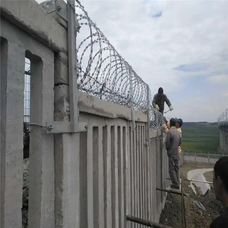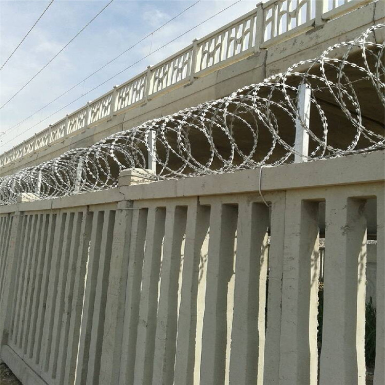 鐵路兩側(cè)水泥柱上安裝刺絲滾籠不僅能保護列車行車安全,而且還起到保護沿線群眾人身安全的作用。鐵路刺絲滾籠防護柵欄主要包括刀片剌網(wǎng),刺繩,和支架及卡扣等。安裝好后具有很好的阻嚇效果,與能起到相同作用的產(chǎn)品比起來性價比是高很多的。主要制作工藝就是由熱鍍鋅鋼板或者不銹鋼鋼板沖壓出尖銳的刀片,然后由高張力鍍鋅鋼絲或者不銹鋼絲來做芯線組合構(gòu)成的防護產(chǎn)品。那鐵路刺絲滾籠要如何安裝使用呢?