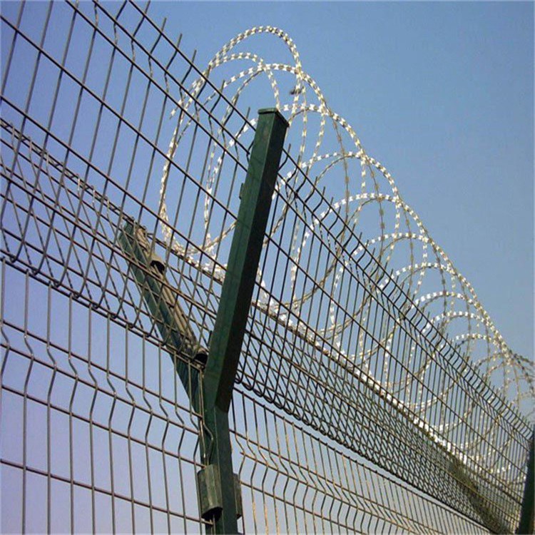 機(jī)場圍界和監(jiān)獄隔離網(wǎng)又稱作“Y型安全防御護(hù)網(wǎng)”,都是由折彎網(wǎng)片,V型支架立柱,加強(qiáng)型焊接片網(wǎng),上面有刀片刺繩(又稱刀刺網(wǎng),刀片護(hù)網(wǎng))安全防盜連接件組成強(qiáng)度和安全防御性級別很高。因立柱外形酷似英文字母Y,所以被稱為Y型安全防御護(hù)網(wǎng)。頂部加裝刀片刺絲、刀片刺網(wǎng)后又很好的增強(qiáng)了安全防護(hù)性能。產(chǎn)品造型美觀、花色多樣,既起到圍欄作用,又起到美化作用。由于具有安全性高、防攀爬能力好,網(wǎng)片連接方式采用特制SBS緊扣件,有效防止人為的破壞性拆卸,橫向2-4道折彎加強(qiáng)筋,使網(wǎng)面強(qiáng)度增加,每6米增加一根斜撐,這樣防風(fēng)性能也加強(qiáng)了。