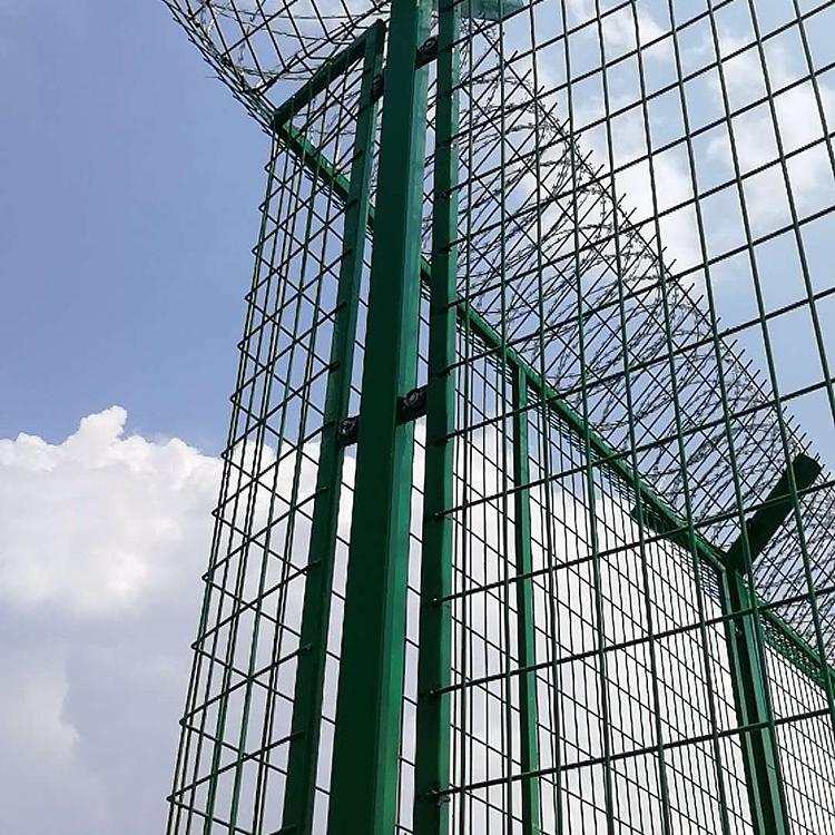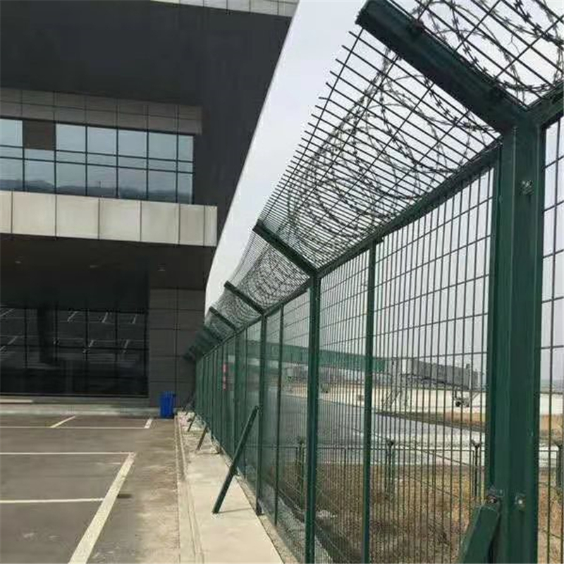 機(jī)場圍欄網(wǎng)又稱作“Y型安全防御護(hù)網(wǎng)”,是由V型支架立柱加強(qiáng)型焊接片網(wǎng),安全防盜連接件和熱鍍鋅刀片刺網(wǎng)組成強(qiáng)度和安全防御性級別很高。被廣泛應(yīng)用在機(jī)場,軍事基地等高安全場所。
