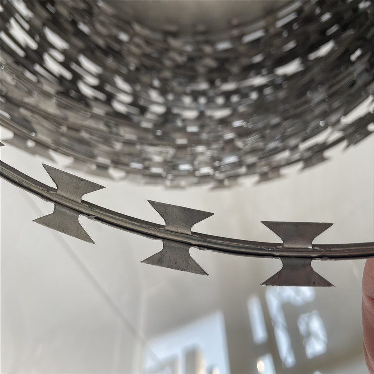 1、制作刀片:選用優(yōu)質(zhì)Q195L熱鍍鋅帶鋼(或者不銹鋼帶鋼),根據(jù)客戶選定的花型,經(jīng)高速?zèng)_床,沖軋成鋒利的刀片刺條,把刀片刺條纏成圓餅狀。