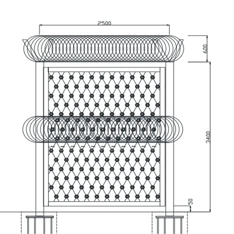 梅花刺片隔離網(wǎng)是由美格網(wǎng)加焊梅花刺片(因其外形類似梅花得名)組合而成的阻絕器材,又叫太陽花刺片鋼網(wǎng)墻。由于梅花刺片隔離網(wǎng)造形獨特不易觸摸,因而能達到很好的防護隔離效果,既美觀又讓人不寒而粟,起到了很好的阻嚇作用。頂部加蛇腹型刀刺網(wǎng),可以用304不銹鋼材質(zhì),雙重防護,可以有效防止非法分子翻越攀爬。美格網(wǎng)的網(wǎng)孔般為:100x100mm,110*110mm,絲徑為:5—8mm,刺片直徑75mm,形狀似太陽,四周布滿刺尖。焊接在美格網(wǎng)每一個交接點處,是由二氧化碳保護焊進行焊接的。下圖為梅花刺片隔離網(wǎng)圖紙參考:高度3400mm*立柱中心距2500mm*厚3.0mm,按圖制作,上裝600mm圈徑的304不繡鋼滾刺網(wǎng)。邊框為50×50mm方管或50*5mm角鋼,然后把焊接打磨好的邊框與網(wǎng)片連接。