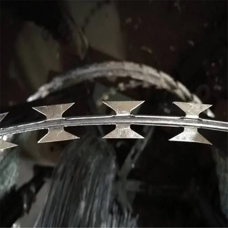 刀片刺繩又叫蛇腹形(型)刀刺網(wǎng)或螺旋型交叉刀片刺網(wǎng),由沖切鋼板采用機(jī)械壓軋?jiān)阡摻z上成型,刀刺寬度22mm,兩刃垂直間距15mm,刀刺縱向間距34mm,芯絲直徑為2.5mm。刀片采用厚度0.5mm的Q195鋼板沖切制作,芯絲由HPB300?6.5mm高線鋼絲加工??纱钆渲Ъ茉趪鷫ι鲜褂?,也可架設(shè)在隔離網(wǎng)上,鐵路、邊防使用率也很高。也可以拉直焊接成網(wǎng)片使用,長(zhǎng)度和寬度可以根據(jù)客戶需求進(jìn)行制作,一般常見的長(zhǎng)度為2-3米,寬度為1.5米-2.5米。可以根據(jù)不同的用途搭配立柱合邊框進(jìn)行自由組合。網(wǎng)孔可設(shè)計(jì)菱形或者方形,材質(zhì)常見的有不銹鋼、熱鍍鋅等,不同的材質(zhì)可根據(jù)環(huán)境和使用條件選擇。焊接刀片隔離網(wǎng)作為一種高效的防護(hù)設(shè)施,其產(chǎn)品規(guī)格和結(jié)構(gòu)特點(diǎn)的不同組合可以滿足不同的使用需求,適用于工廠、學(xué)校、軍事基地、機(jī)場(chǎng)、大型活動(dòng)場(chǎng)地等各種需要防護(hù)的場(chǎng)所,是一種重要的安全配置。