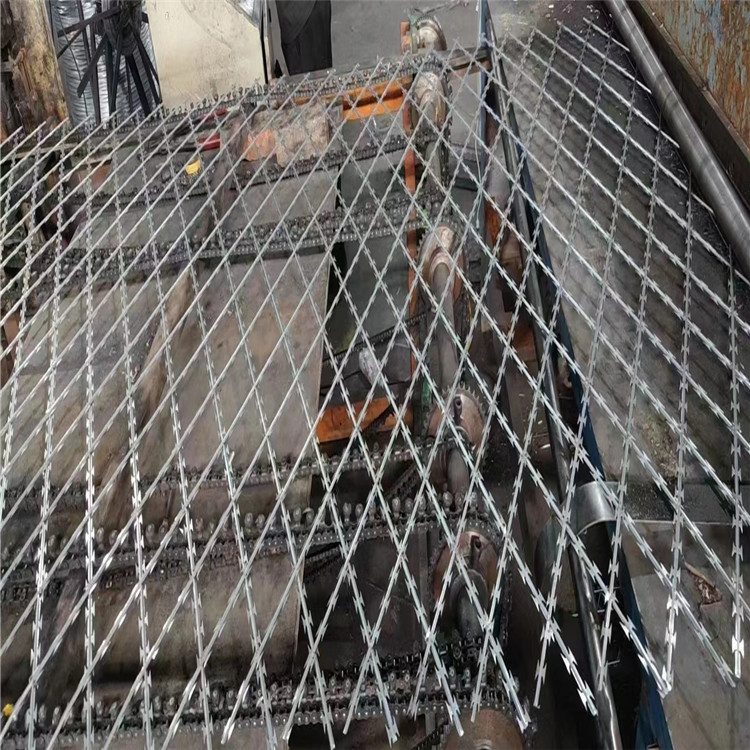監(jiān)獄焊接刀片隔離網(wǎng)選用優(yōu)質(zhì)Q195L熱鍍鋅帶鋼(或者不銹鋼帶鋼),根據(jù)客戶選定的花型,經(jīng)高速?zèng)_床,沖軋成鋒利的刀片刺條,把刀片刺條纏成圓餅狀。把沖好的刀片裹在熱鍍鋅絲上面,經(jīng)調(diào)直達(dá)到預(yù)定的長(zhǎng)度自動(dòng)切斷,送入到模具內(nèi),排焊機(jī)把經(jīng)和緯相交叉的部分,沖過(guò)電流焊接到一起,數(shù)控電機(jī)拉動(dòng)網(wǎng)片前進(jìn)一格,達(dá)到網(wǎng)片的長(zhǎng)度后,排焊機(jī)自動(dòng)停止工作,一張焊接好的刀片刺繩網(wǎng)片,就完成了,將焊接好的刀刺網(wǎng)按照施工圖紙對(duì)網(wǎng)面進(jìn)行進(jìn)一步處理,焊接好邊框和立柱后就可以進(jìn)行表面處理了。表面處理的方式有兩種高亮銀粉磁漆處理和噴塑處理(也叫PVC處理)銀粉磁漆處理的優(yōu)點(diǎn)不影響刀片的鋒利,看起來(lái)刀片閃閃發(fā)亮,恐嚇性好,讓人望而生畏!