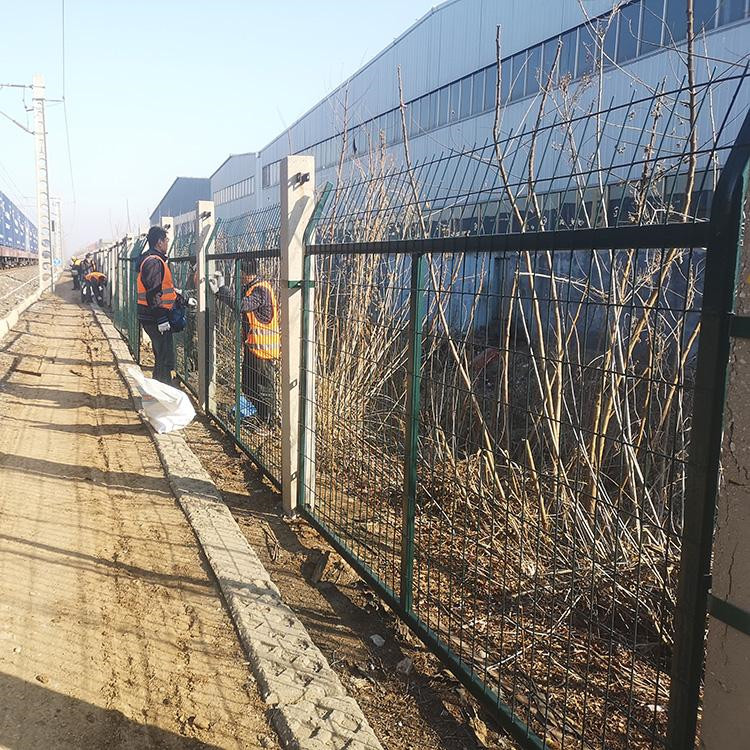 鐵路防護網(wǎng)安裝方法步驟:先用M10*142mm的螺栓穿過水泥立柱上預(yù)留的孔,同時用配套的防盜墊圈和螺母將兩個連接板A分別固定于混凝土立柱兩側(cè);再用M10*22mm的螺栓,配相應(yīng)的防盜墊圈和螺母將連接板A和連接板B固定;調(diào)整金屬網(wǎng)片垂直、水平度,用專用工具講螺栓、螺母固定牢固即可。防護柵欄安裝時做到:嚴(yán)、齊、順、美,橋下封閉不得留有空隙,柵欄方向沿橋梁方向順直。 應(yīng)對柵欄兩側(cè)地面進行平整壓實,當(dāng)柵欄設(shè)置在坡地或柵欄兩側(cè)存在高低差時,應(yīng)將柵欄兩側(cè)范圍高出部分進行平整,保證柵欄對于兩側(cè)地面均達(dá)到防護高度。