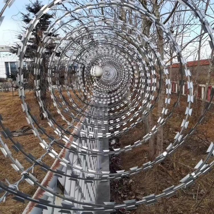 刺絲滾籠又叫刀片刺網(wǎng),刀刺網(wǎng),刀片刺繩,常用的材質(zhì)是熱鍍鋅和不銹鋼304的。根據(jù)刀花的形狀,分為