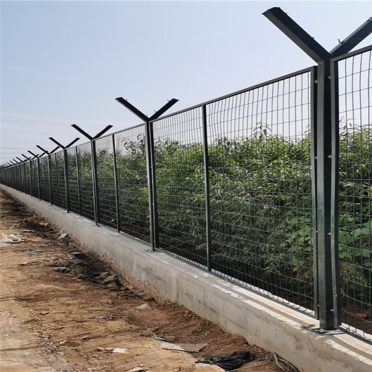 飛機(jī)場(chǎng)圍界又稱作“Y型安全防御護(hù)網(wǎng)”,是由V型支架立柱,加強(qiáng)型焊接片網(wǎng),安全防盜連接件和熱鍍鋅刀片刺籠組成強(qiáng)度和安全防御性級(jí)別很高。近年來(lái),被廣泛應(yīng)用在機(jī)場(chǎng),軍事基地等高安全場(chǎng)所。在隔離網(wǎng)頂部加裝刀片刺絲、刀片刺繩后又很好的增強(qiáng)了防護(hù)性能。